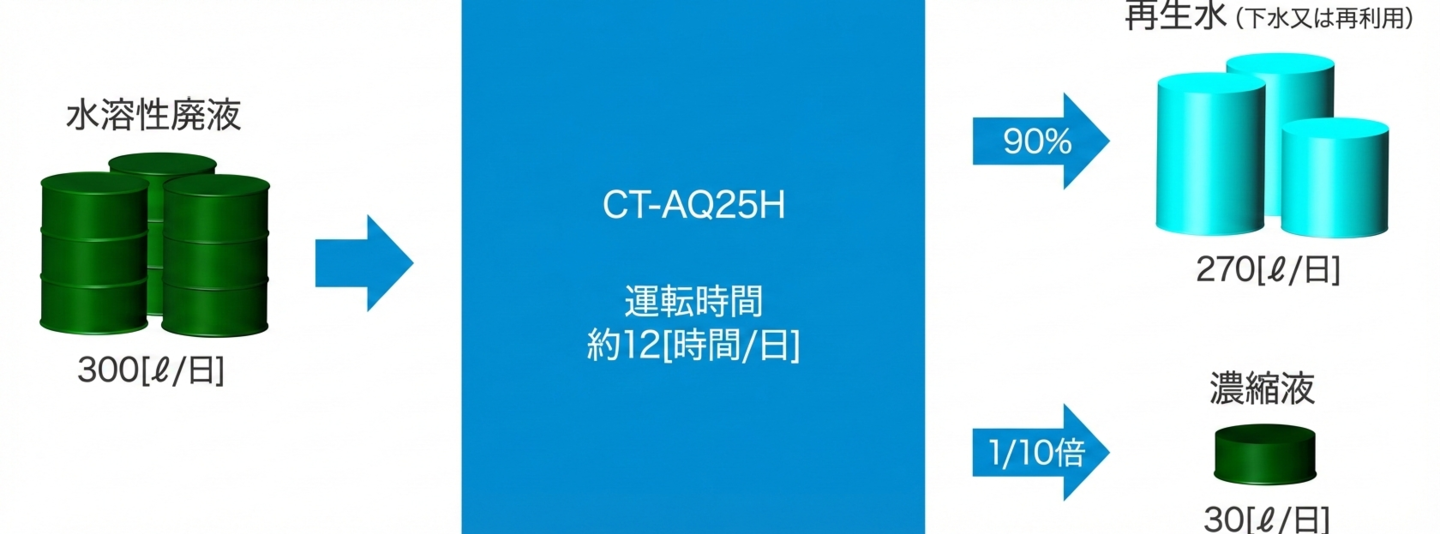 「減圧蒸留方式」とは、減圧濃縮釜に自動で吸引した廃液をヒーターで低温沸騰させ、発生した蒸気を冷凍機で凝縮して再生水として回収する方式です。