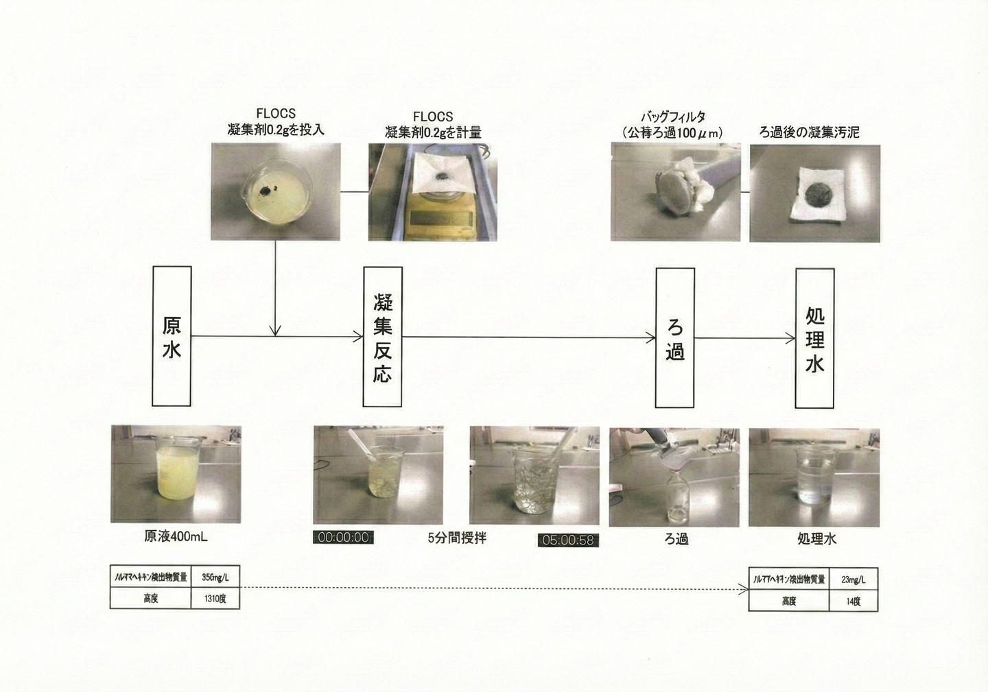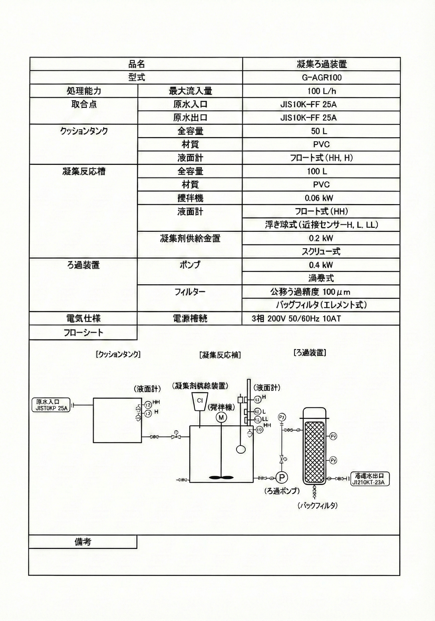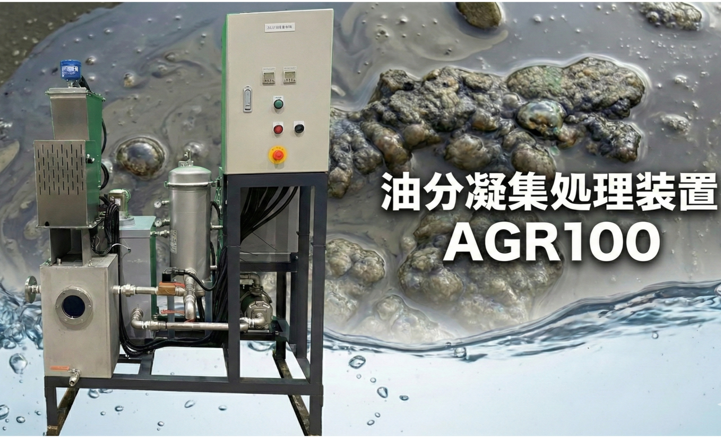 油分凝集処理装置の特徴について 低濃度の油分を凝集剤にて凝集させます。 凝集沈殿した汚泥は、濾過機構で濾過してから排水します。 凝集剤投入及び濾過から排水まで自動で行います。 蒸留処理の2次処理に導入可能です。 FLOCS凝集剤を使用して処理を行うと効果的です。 濾過はバッグフィルター式を採用しております。 仕様・フロー 蒸留処理後の2次処理 FLOCS series REO series 水処理装置