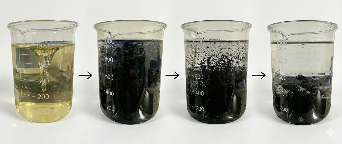 ※写真は特殊吸着剤ELC300と粉末活性炭配合凝集剤CO-5MGを各1,000mg/L添加て各5分反応させて凝集沈殿させたものです。