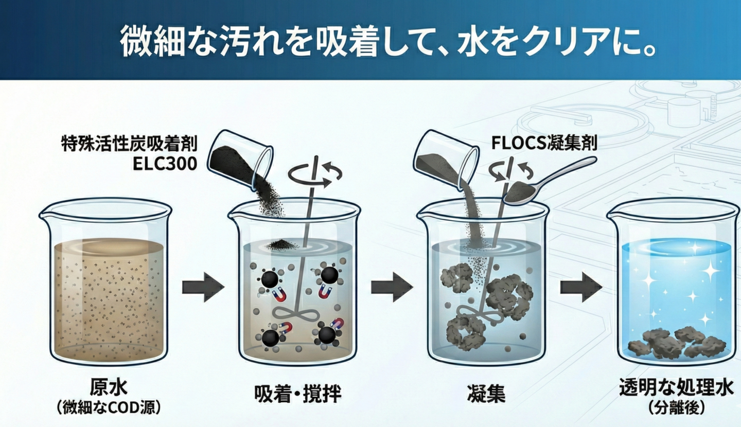 特殊活性炭吸着剤ELC-300の特徴について 吸着性能が非常に高く微分子のCODmnやBOD5源を効率的に吸着し水質の改善が可能です。また色度の大幅な改善も可能 凝集処理前に使用することで凝集効率や凝集力がアップします。 特に水溶性の塗料や切削油の前処理で多くご使用頂いております。 FLOCS凝集剤との併用で最大限に効果を発揮します。 使用方法は凝集剤添加前ELC-300を添加して5分ほど撹拌するだけです。 イメージ図 FLOCS series REO series 水処理装置