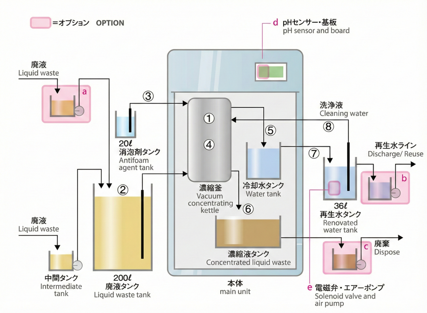 「減圧蒸留方式」とは、減圧濃縮釜に自動で吸引した廃液をヒーターで低温沸騰させ、発生した蒸気を冷凍機で凝縮して再生水として回収する方式です。