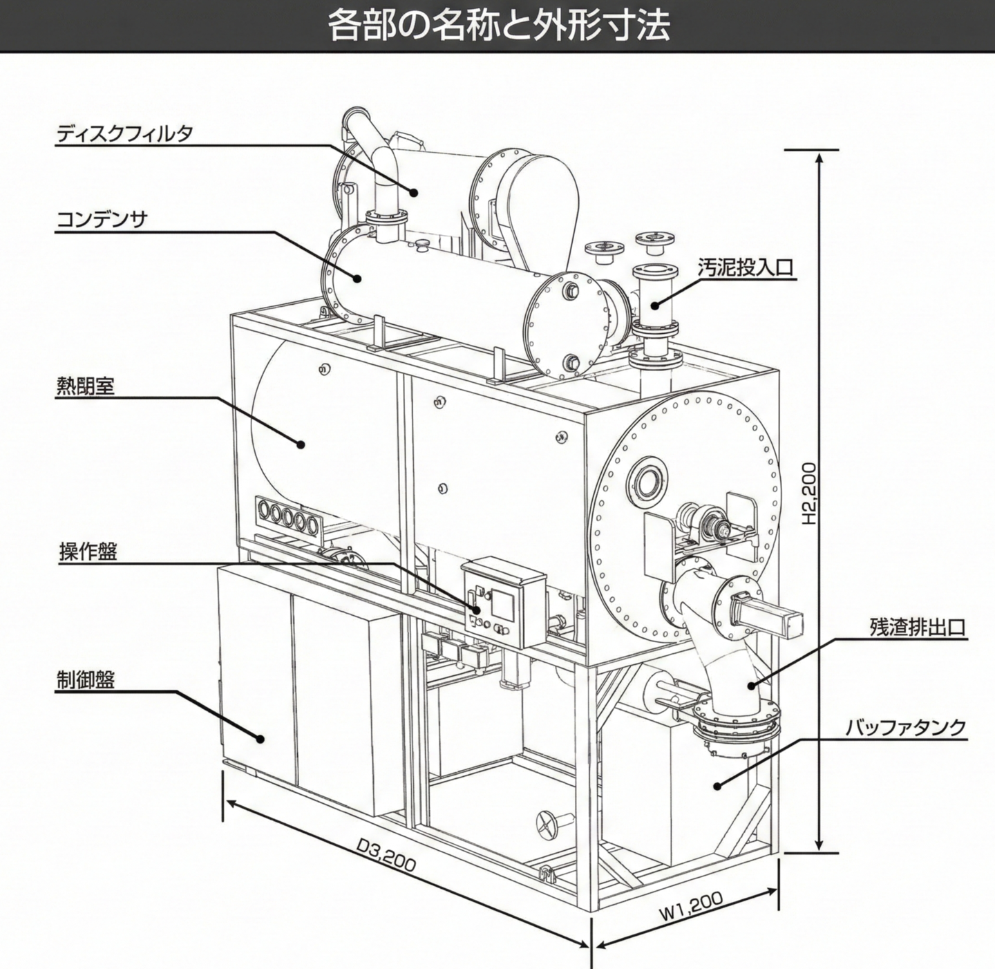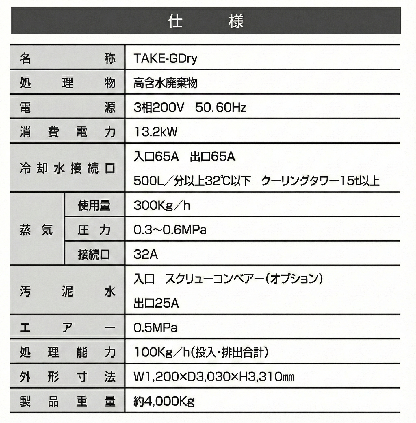 1バッチあたり350kgの高含水廃棄物が約3.6㎡の設置面積で処理可能。