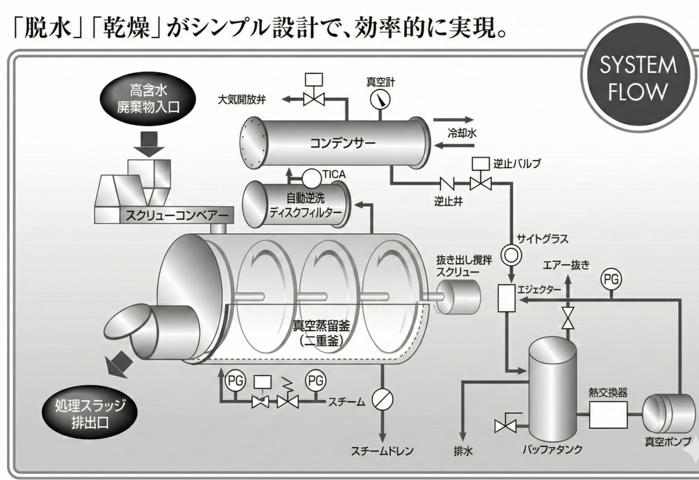 高含水廃棄物を減圧下で乾燥します、産業廃棄物を削減し、再利用など環境保全に実力を発揮します