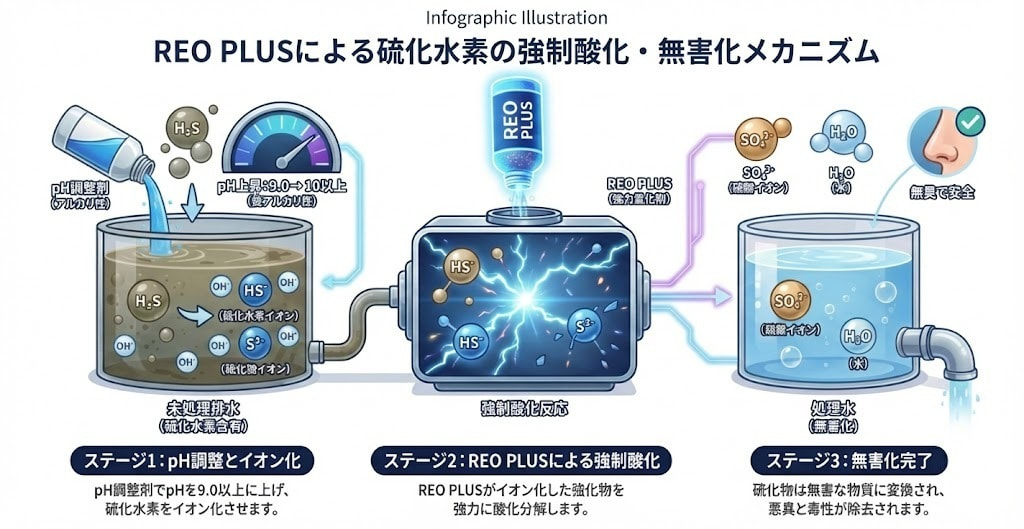 REO PLUSを用いて硫化水素を含む排水を無害化する手法は硫化水素の毒性と腐食性を排除し、悪臭を消すために有効ですが、安全管理(特にガスの発生)と沈殿物の処理に注意が必要です。