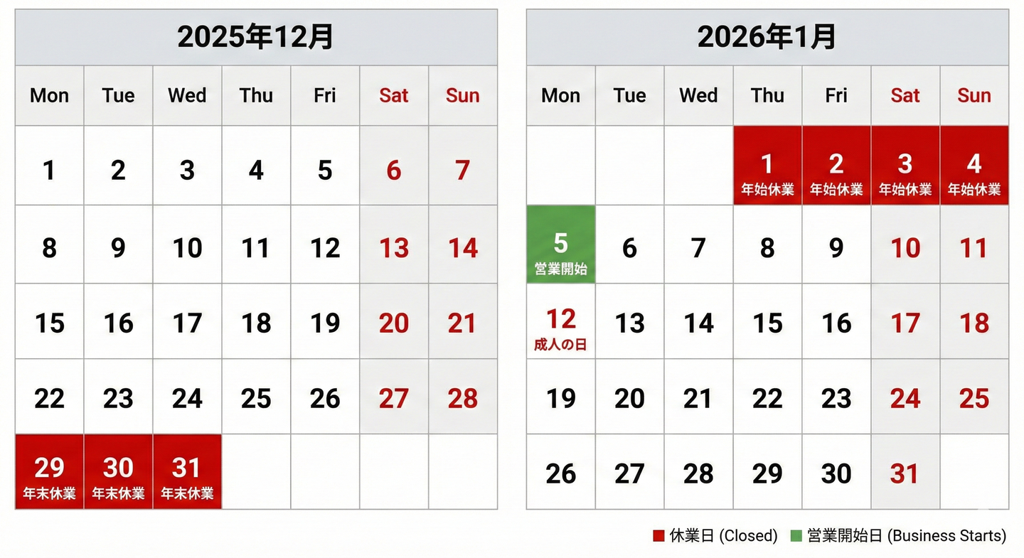 2025-2026年年末年始の営業に関するお知らせ No.REK2025001 2025年12月1日 アールエナジー株式会社 拝啓貴社ますますご清栄のこととお喜び申し上げます。平素は格別のお引き立てを賜り誠にありがとうございます。さて、来たる年末年始の期間につきまして、営業日及び休業日を下記の通りとさせて頂きます。何かとご迷惑をおかけ致しますが、何卒宜しくお願い申し上げます。 FLOCS series REO series 水処理装置