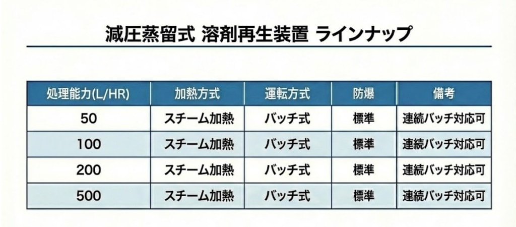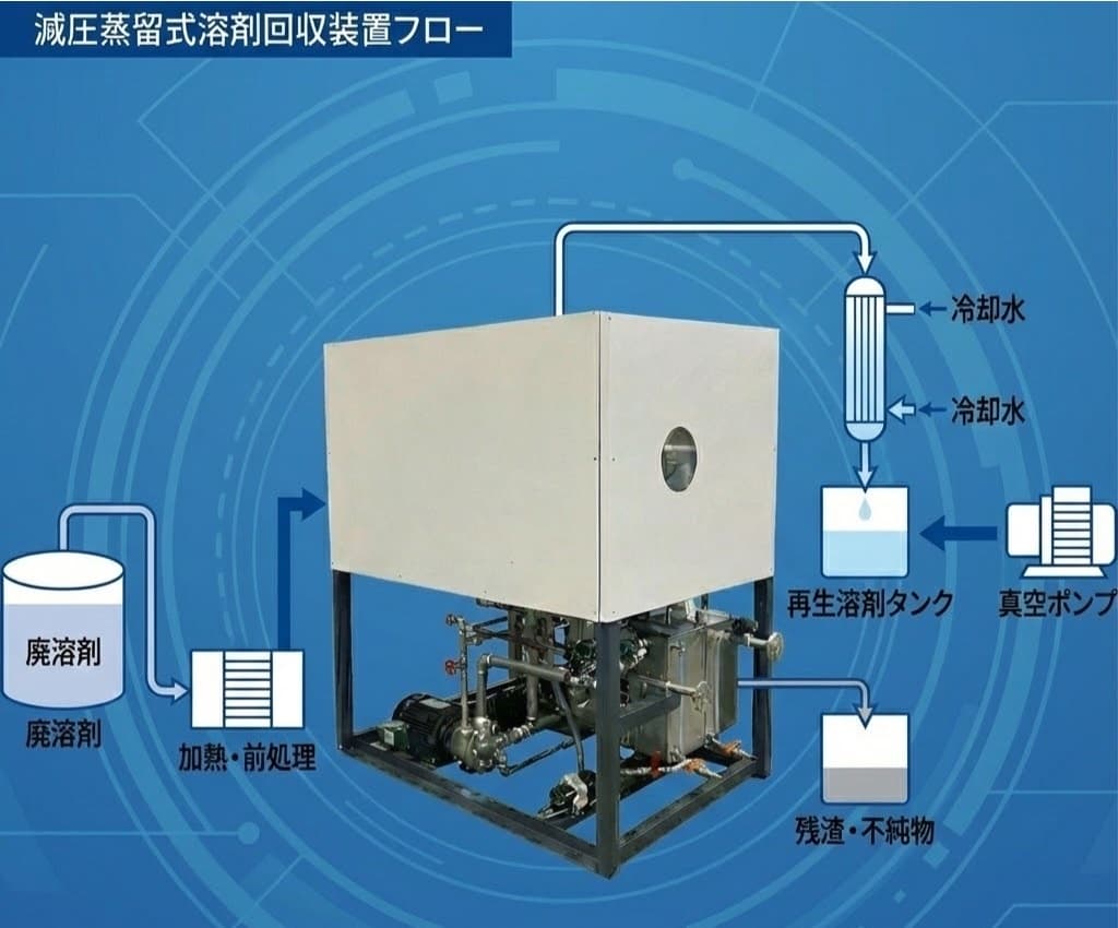 減圧蒸留式廃溶剤回収再生装置の特徴について 一般的なトルエン・キシレン、アセトンから特殊で高価な溶剤を蒸留して再利用することが可能。 50L/hr〜500L/hrまで標準ラインナップ。 臭気、騒音も細かく配慮。 省スペース設計 安全増防爆仕様も可能 フローイメージ ラインナップ FLOCS series REO series 水処理装置