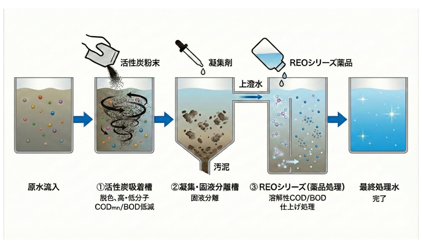 | 活性炭粉末(炭質)処理水にREO PLUSを添加したCODmn低減処理データー | |||||
