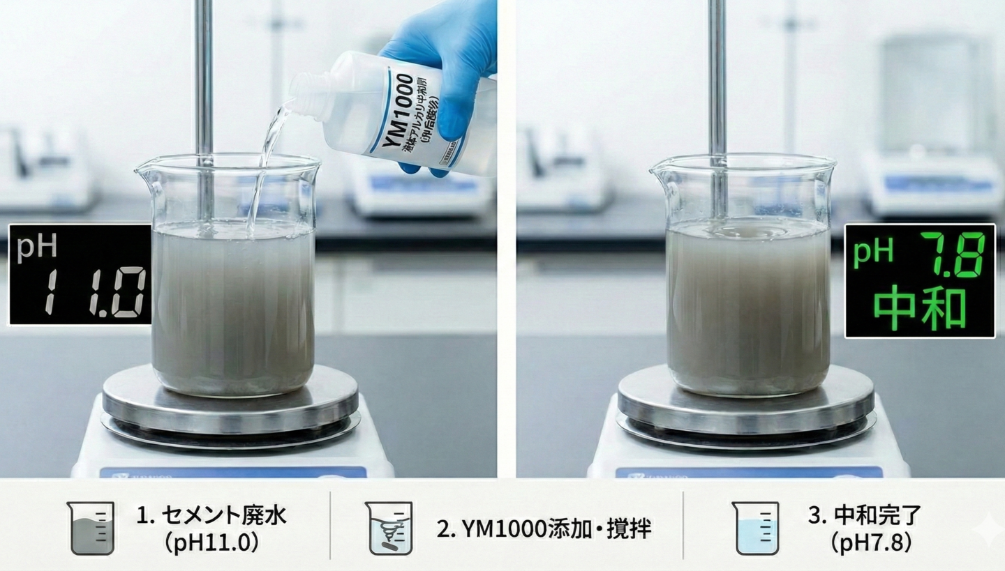 アルカリ廃水中和剤YM-1000の特徴について YM1000は主成分が有機酸で劇物に該当せず安全に取り扱えます。 セメントやモルタル洗浄廃水などアルカリ廃水の中和処理に最適。 添加攪拌して1分程度でpH11.0の洗浄廃水がpH7.8まで中和。 作業者の負担リスクの軽減、高い経済性と作業効率を両立します。 イメージ図 FLOCS series REO series 水処理装置